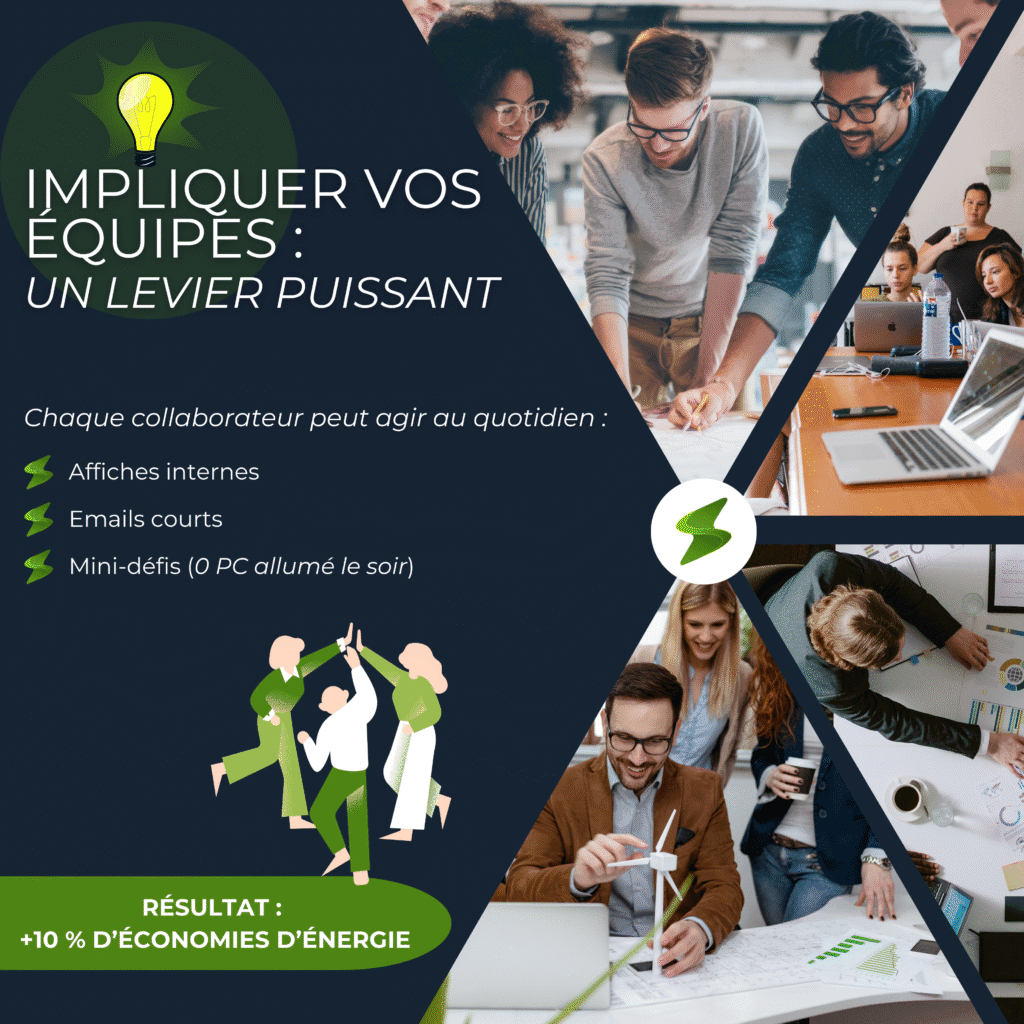 Organisez une campagne de sensibilisation interne : affiches, emails, mini-défis comme « éteindre 100 % des ordinateurs chaque soir ».