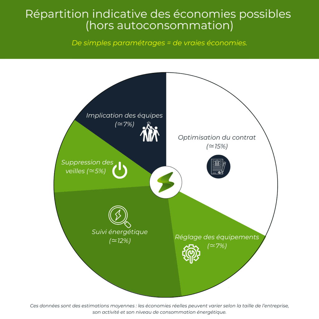 Ces données sont des estimations moyennes : les économies réelles peuvent varier selon la taille de l’entreprise, son activité et son niveau de consommation énergétique.
