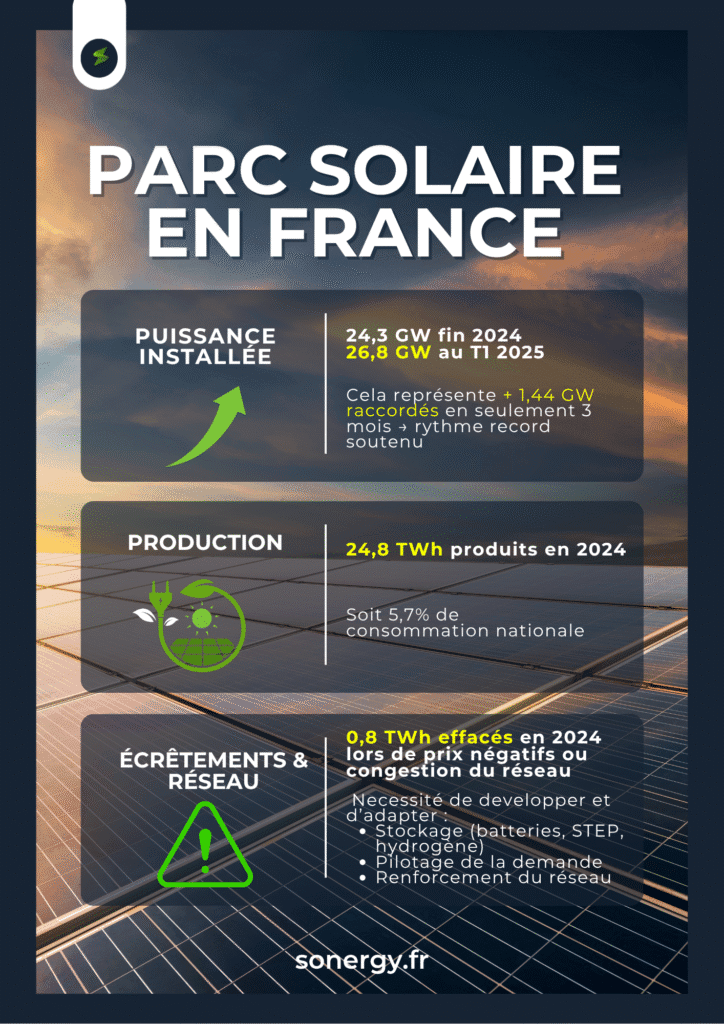 - 26,8 GW au 31/03/2025 (SDES – Stat’Info Solaire T1 2025).