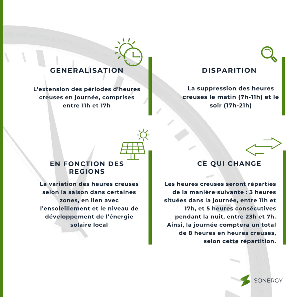 Les principes généraux de la réforme établissent 8 heures creuses par jour, réparties entre une plage nocturne d’au moins 5h consécutives et une plage diurne pouvant aller jusqu’à 3h, souvent située entre 11h et 17h. Cette réorganisation s’accompagne de la fin progressive des heures creuses en matinée (7h–11h) et en soirée (17h–23h).