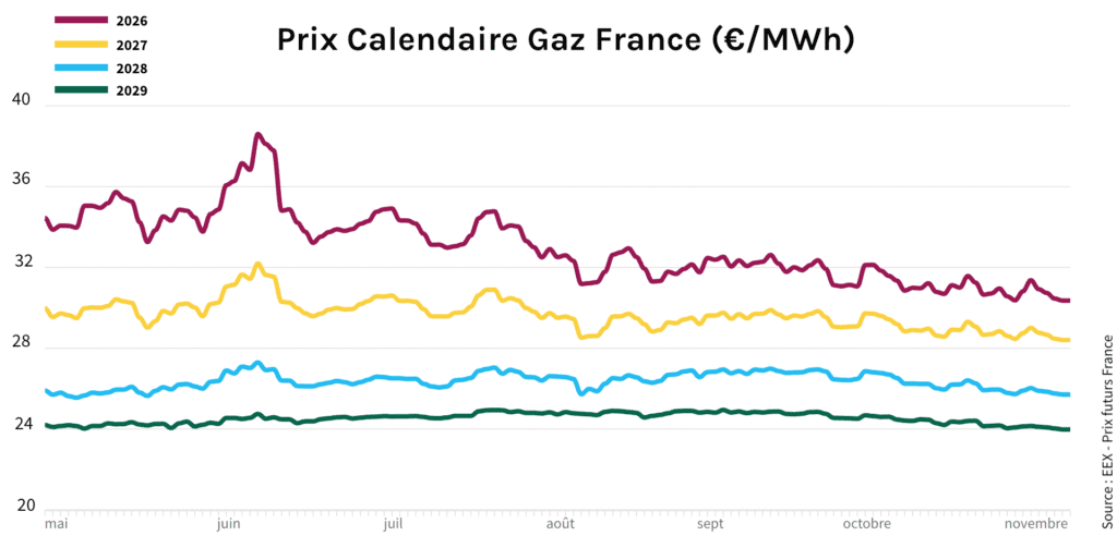 Le marché du gaz continue d’attirer l’attention à l’approche de la saison froide. Les niveaux de stockage européens restent un indicateur clé : bien qu’ils soient élevés, l’équilibre demeure fragile en raison d’importations moins régulières et d’une demande encore très sensible aux variations climatiques. Les tensions pré-hivernales se renforcent également par une concurrence accrue sur le gaz naturel liquéfié, disputé entre l’Europe et l’Asie.
