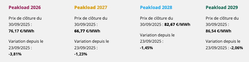 Les contrats peakload affichent des baisses encore plus marquées que les contrats baseload, avec une décrue de 3,81% pour l’échéance 2026, reflétant une moindre tension sur les périodes de forte consommation.