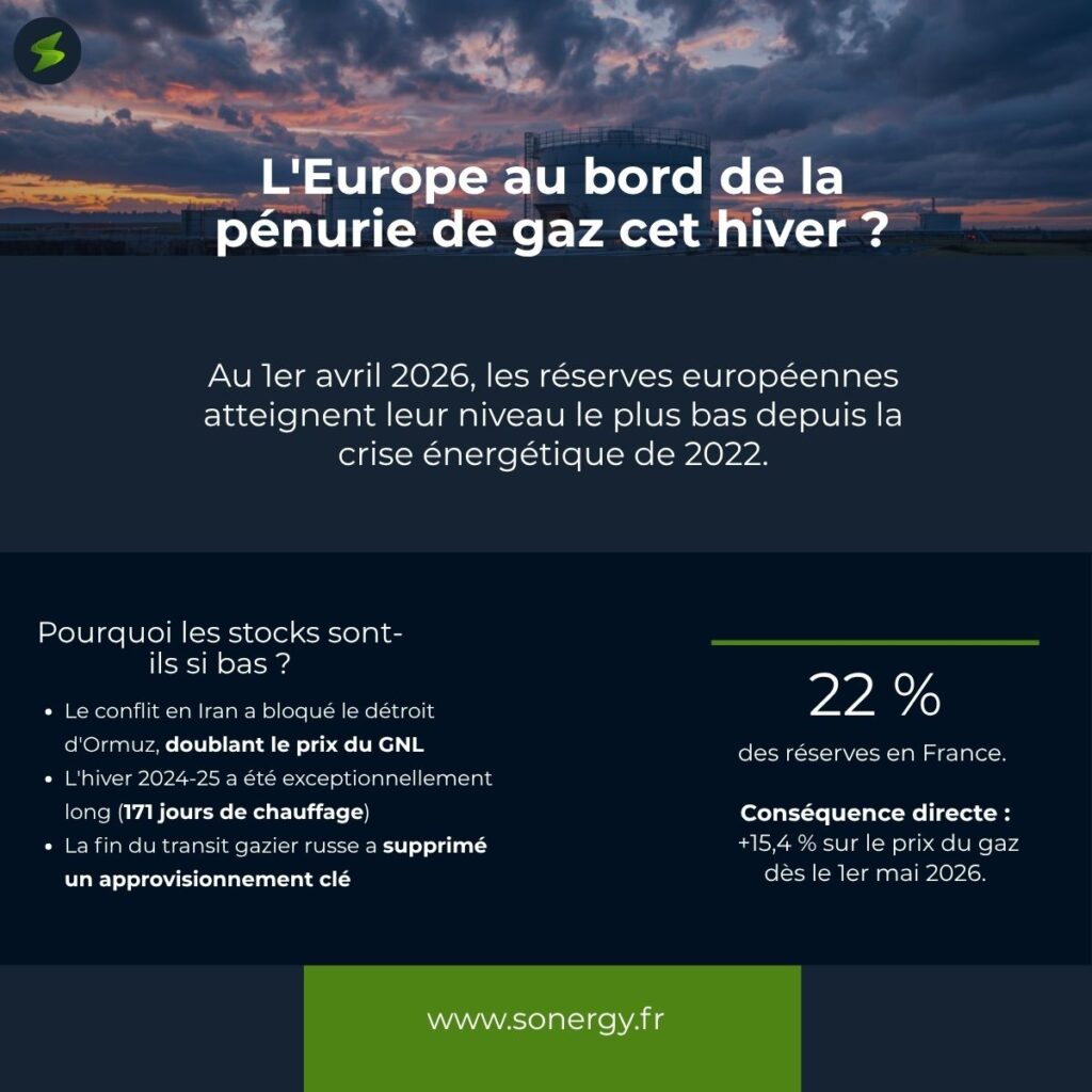 Les stocks de gaz européens sont-ils au plus bas depuis 2022 ? Oui. Au 1er avril 2026, le taux de remplissage affiche 28 % en Europe (22 % en France), le niveau le plus bas depuis la crise énergétique de 2022, contre 59 % à la même date en 2024.